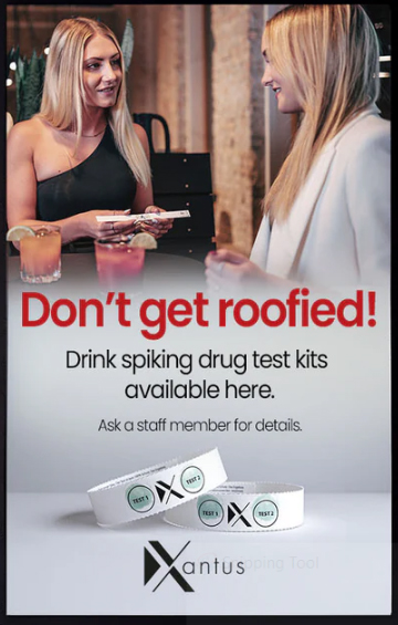"Don't get roofied! Drink spiking drug test kits available here. Ask a staff member for details."